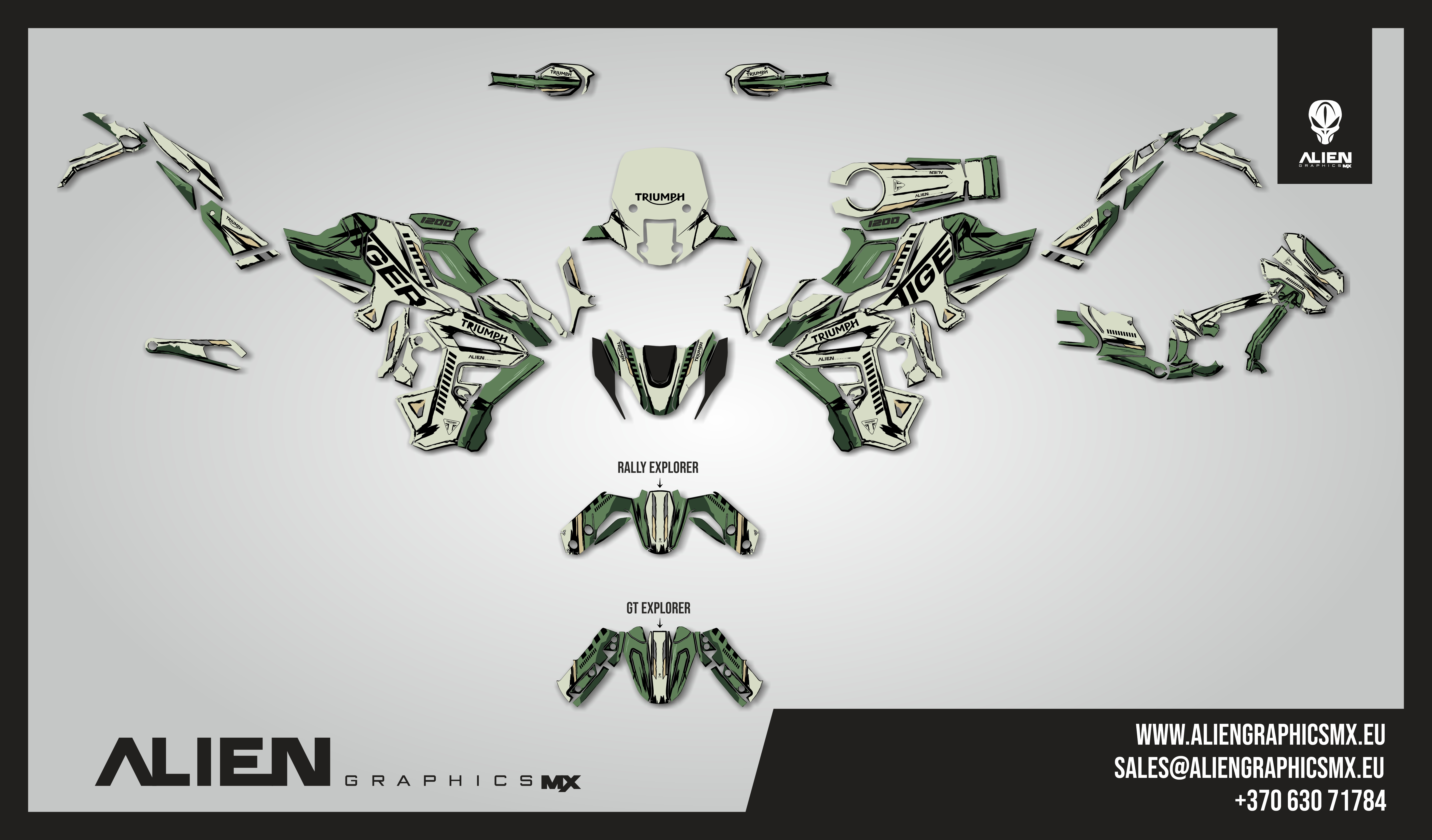 Premium motorcycle Graphic Kit (Decal Kit, Sticker Kit) for the TRIUMPH TIGER 1200 GT Explorer / RALLY Explorer 2022-2025 – manufactured from extremely durable, long-lasting materials and printed using professional-grade equipment for vivid, high-resolution colors.
