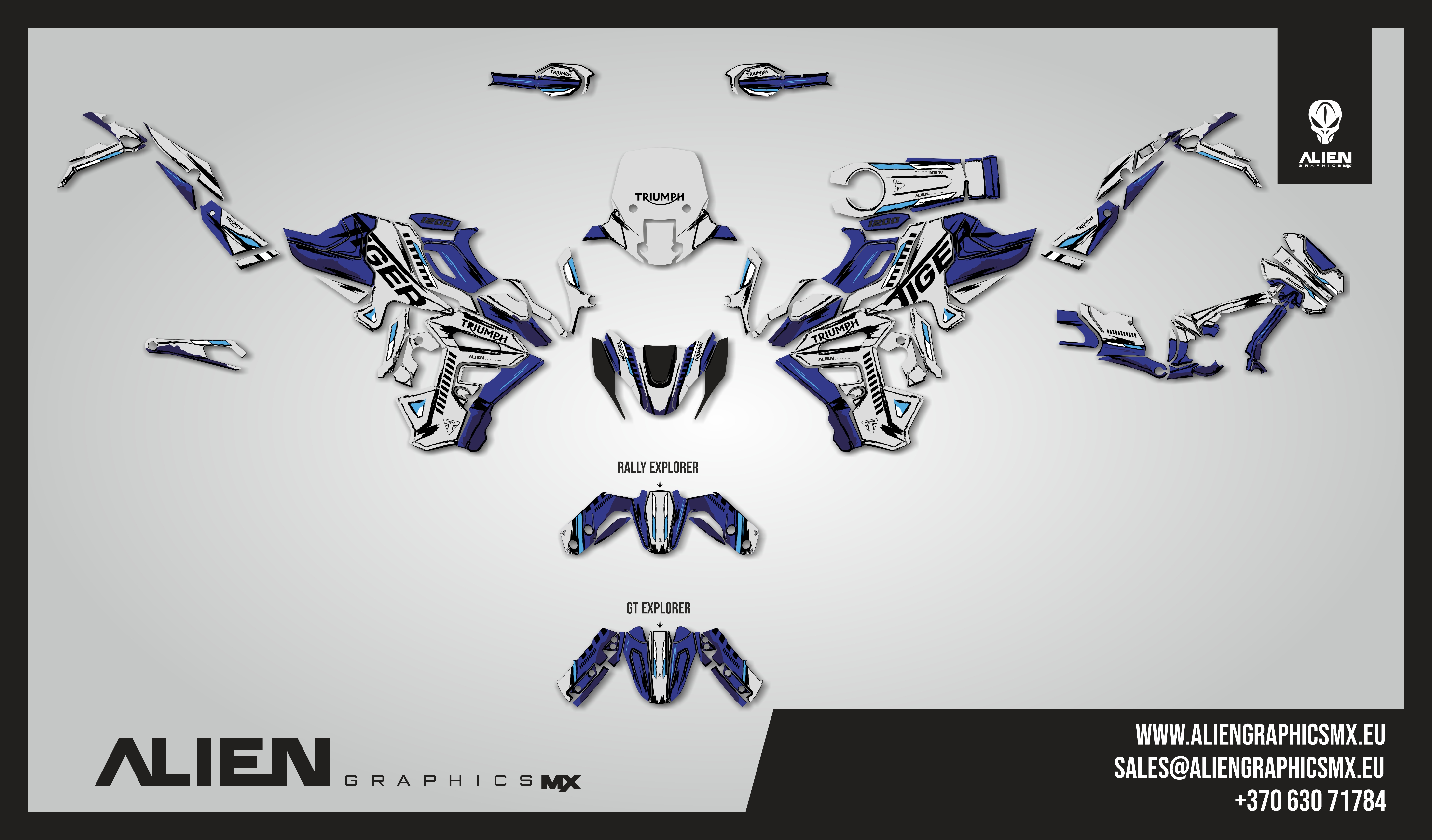 Aukščiausios klasės motociklo lipdukų rinkinys (grafikos / lipdukų komplektas) TRIUMPH TIGER 1200 GT Explorer / RALLY Explorer 2022-2025 modeliui – gaminamas iš itin patvarių, ilgaamžių medžiagų ir spausdinamas profesionalia įranga, užtikrinančia ryškias, aukštos raiškos spalvas. Pasidarykite ir sau!